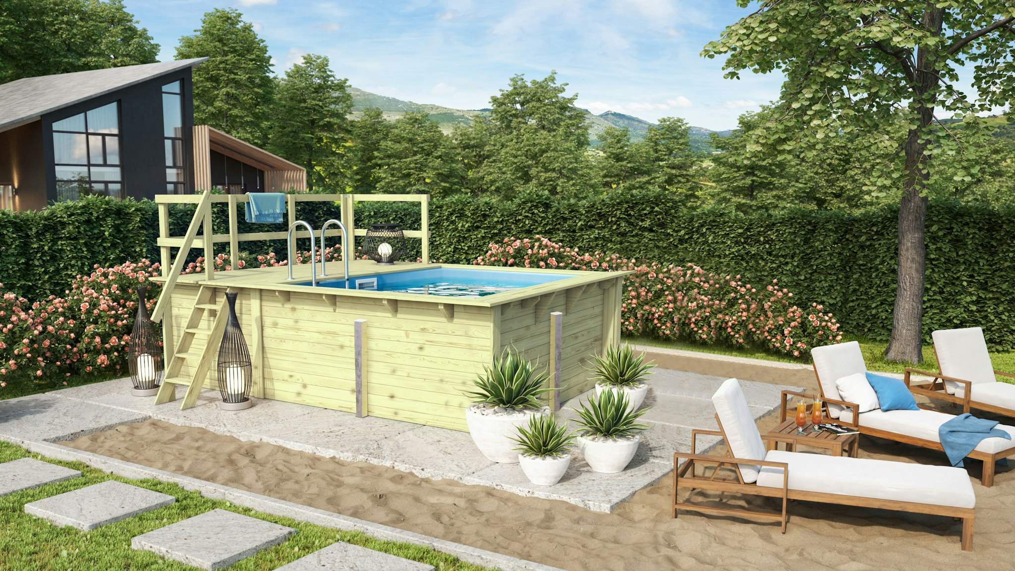 - Bei den Varianten inkl. Terrasse: Die Terrasse kann als Technikraum für die Sandfilteranlage genutzt werden und kommt inkl. Tür.